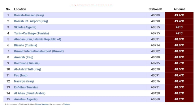 نشر المركز العربي للمناخ قائمة اعلى 10 درجات حرارة مسجلة عالميا لهذا اليوم 25 جويلية 2023 والتي تجاوزت حاجز 48 درجة مئوية.