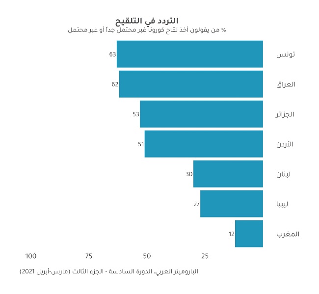 جاء في استطلاع أنجزه “البارميتر العربي” ونشره على تويتر، أن تونس تصدرت الدول العربية في مؤشر تردّد مواطنينها لأخذ التلقيح ضد كورونا حيث أن 63 % من المستجوبين في تونس أجابوا بأن “أخذ التلقيح غير محتمل جدا أو غير محتمل”.