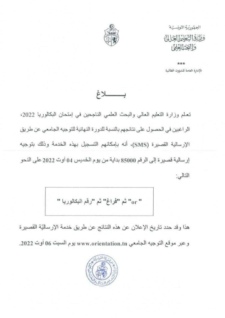 أعلنت وزارة التعليم العالي والبحث العلمي اليوم الخميس عن انطلاق التسجيل للحصول على النتائج النهائية للتوجيه الجامعي بالنسبة للناجحين في امتحان البكالوريا 2022 .