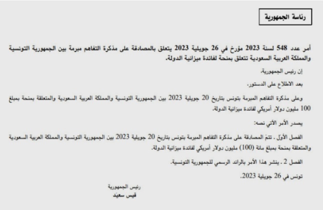 صدر في العدد الأخير من الرائد الرسمي للجمهورية التونسية ليوم الأربعاء 26 جويلية 2023 الأمر عدد 548 لسنة 2023 مؤرخ يوم 26 جويلية يتعلق بالموافقة على مذكرة التفاهم بين الجمهورية التونسية والمملكة العربية السعودية تتولى بموجبها الأخير منح ميزانية الدولة 100 مليون دولار أمريكي (أكثر من 300 مليار من المليمات التونسية).