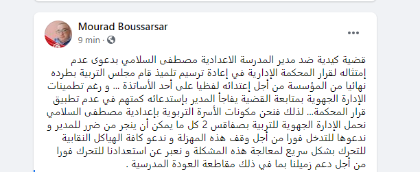 أفاد الأستاذ النقابي مراد بوصرصار أنه “على اثر قضية كيدية ضد مدير المدرسة الاعدادية مصطفى السلامي بطريق الأفران بصفاقس بدعوى عدم إمتثاله لقرار المحكمة الإدارية في إعادة ترسيم تلميذ قام مجلس التربية بطرده نهائيا من المؤسسة من أجل إعتدائه لفظيا على أحد الأساتذة … و رغم تطمينات الإدارة الجهوية بمتابعة القضية يفاجأ المدير بإستدعائه كمتهم في عدم تطبيق قرار المحكمة… لذلك فنحن مكونات الأسرة التربوية بإعدادية مصطفى السلامي نحمل الإدارة الجهوية للتربية بصفاقس 2 كل ما يمكن أن ينجر من ضرر للمدير و ندعوها للتدخل فورا من أجل وقف هذه المهزلة و ندعو كافة الهياكل النقابية للتحرك بشكل سريع لمعالجة هذه المشكلة و نعبر عن استعدادنا للتحرك فورا من أجل دعم زميلنا بما في ذلك مقاطعة العودة المدرسية .”