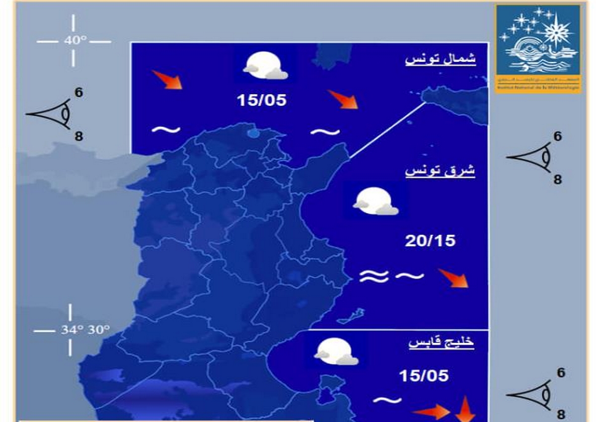 يكون الطقس صاف الى قليل السحب باغلب الجهات ليل الاثنين، وفق نشرة متابعة للمعهد الوطني للرصد الجوي.وينتظر ان تتراوح درجات الحرارة، ليلا، بين 26 و31 درجة. ويسجل هبوب رياح ضعيفة إلى معتدلة في ما يكون البحر قليل الاضطراب