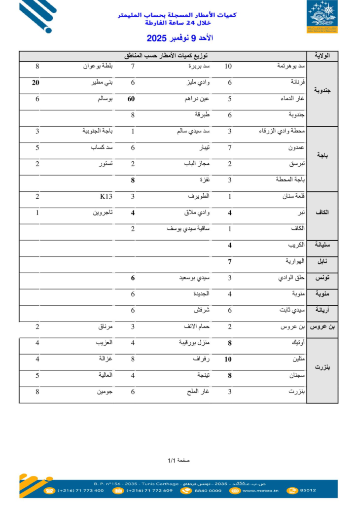 سجلت العديد من مناطق الجمهورية خلال الـ24 ساعة الماضية نزول كميات متفاوتة من الأمطار، تراوحت بين 1 مم في عدة جهات كالكاف وتاجروين و60 مم في عين دراهم من ولاية جندوبة.