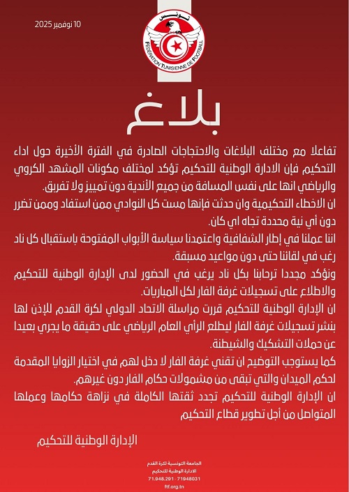 أصدرت الإدارة الوطنية للتحكيم بلاغًا توضيحيًا اليوم الاثنين 10 نوفمبر 2025، على خلفية تعدد الاحتجاجات والبيانات الصادرة مؤخرًا حول أداء الحكام خلال المباريات الأخيرة في البطولة.