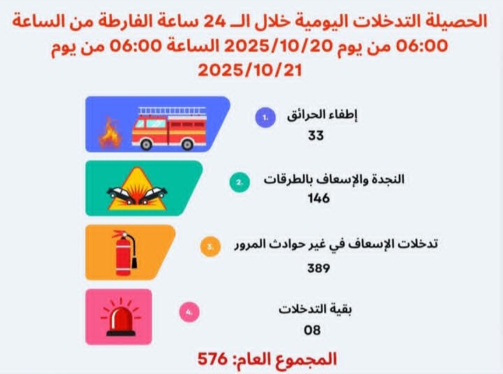 قامت وحدات الحماية المدنية خلال الــ 24 ساعة الفارطة من الساعة 06:00 من يوم 2025/10/20 إلى الساعة 06:00 من يوم 2025/10/21 بتسجيل عدد 576 تدخل.