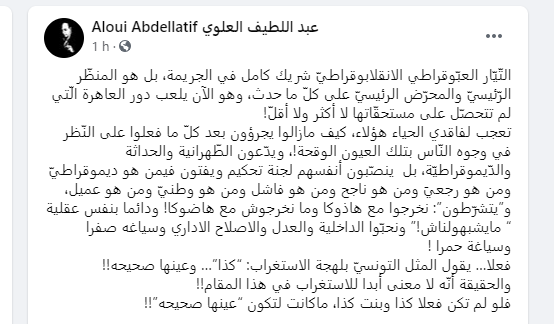 قال النائب المجمد عبد اللطيف العلوي على صفحته الخاصة : ” التّيّار العبّوقراطي الانقلابوقراطيّ شريك كامل في الجريمة، بل هو المنظّر الرّئيسيّ والمحرّض الرئيسيّ على كلّ ما حدث، وهو الآن يلعب دور العاهرة الّتي لم تتحصّل على مستحقّاتها لا أكثر ولا أقلّ!تعجب لفاقدي الحياء هؤلاء، كيف مازالوا يجرؤون بعد كلّ ما فعلوا على النّظر في وجوه النّاس بتلك العيون الوقحة!، ويدّعون الطّهرانية والحداثة والدّيموقراطيّة، بل ينصّبون أنفسهم لجنة تحكيم ويفتون فيمن هو ديموقراطيّ ومن هو رجعيَ ومن هو ناجح ومن هو فاشل ومن هو وطنيّ ومن هو عميل، و”يتشرّطون”: نخرجوا مع هاذوكا وما نخرجوش مع هاضوكا! ودائما بنفس عقلية “ مايشبهولناش!”