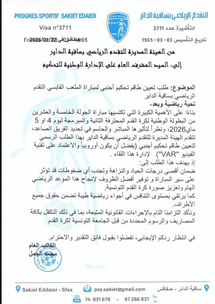 تقدم ساقية الداير يطالب بطاقم تحكيم أجنبي و اعتماد تقنية ال VAR لمباراته ضد الملعب القابسي.