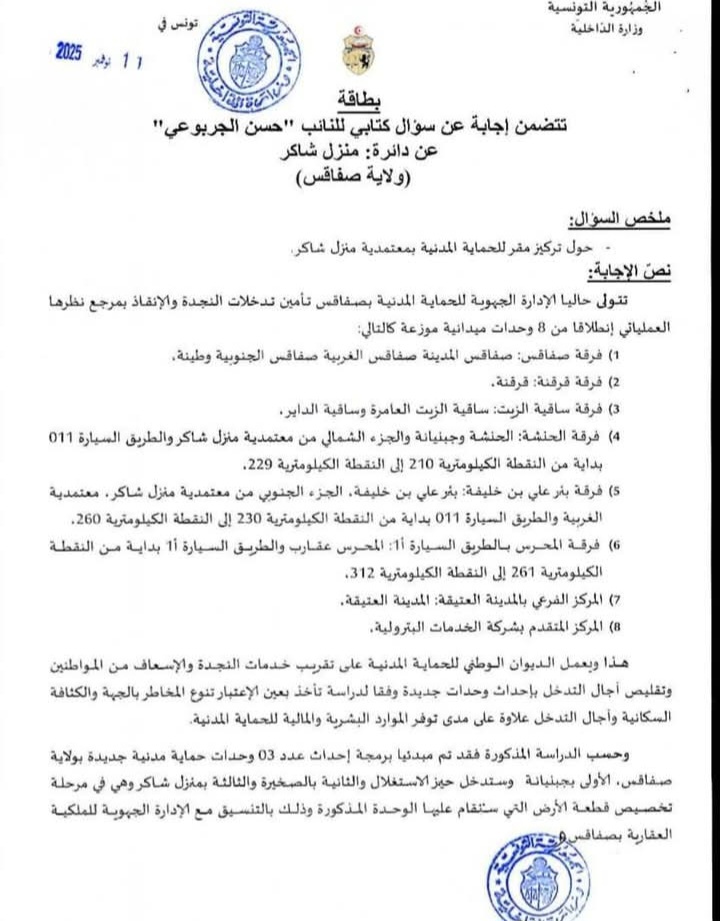 جواب وزارة الداخلية منذ 26 سبتمبر 2025 على الاستفسار المتعلّق بـ تركيز مقر للحماية المدينة بمنزل شاكر