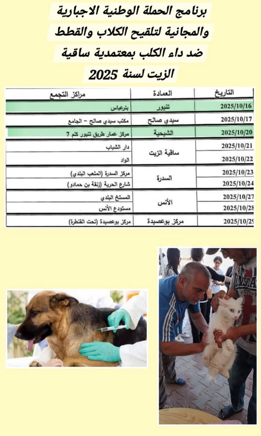 برنامج الحملة الوطنية المجانية والاجبارية لتلقيح الكلاب والقطط ضد داء الكلب بمعتمدية