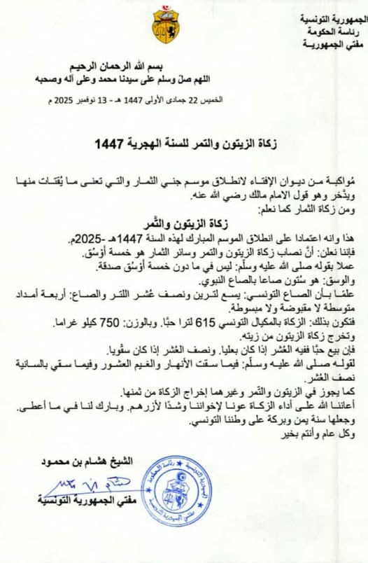 اصدر ديوان مفتي الديار التونسية بلاغا حول زكاة الزيتون والتمر للسنة الهجرية 1447