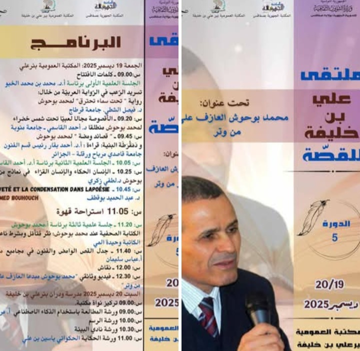 تحت عنوان “محمد بوحوش العازف على أكثر من وتر” ينتظم اليوم وغدا 19 و 20 ديسمبر 2025 بالمكتبة العمومية ببر علي بن خليفة، ملتقى علي بن خليفة للقصة في دورته الخامسة وفقا للبرنامج التالي.:
