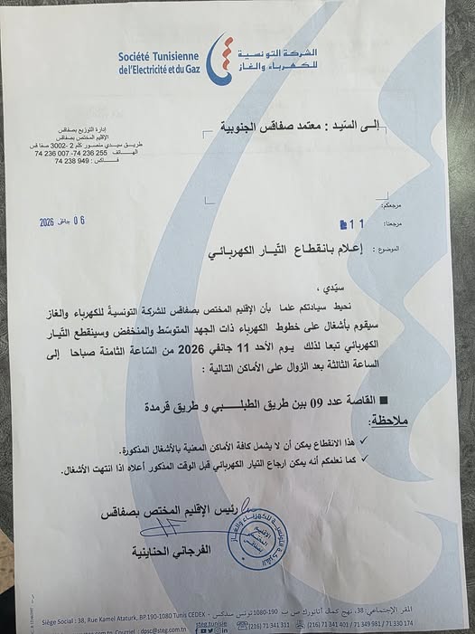 يعلم الاقليم المختص بالشرطة التونسية للكهرباء والغاز ان التيار الكهربائي سينقطع يوم الاحد 11 جانفي 2026 من الساعة الثامنة صباحا الى الثالثة بعد الزوال بالقاصة بالكلم 9 الرابطة بين الطبلبي وقرمدة وذلك بسبب الاشغال التي ستقوم بها .
