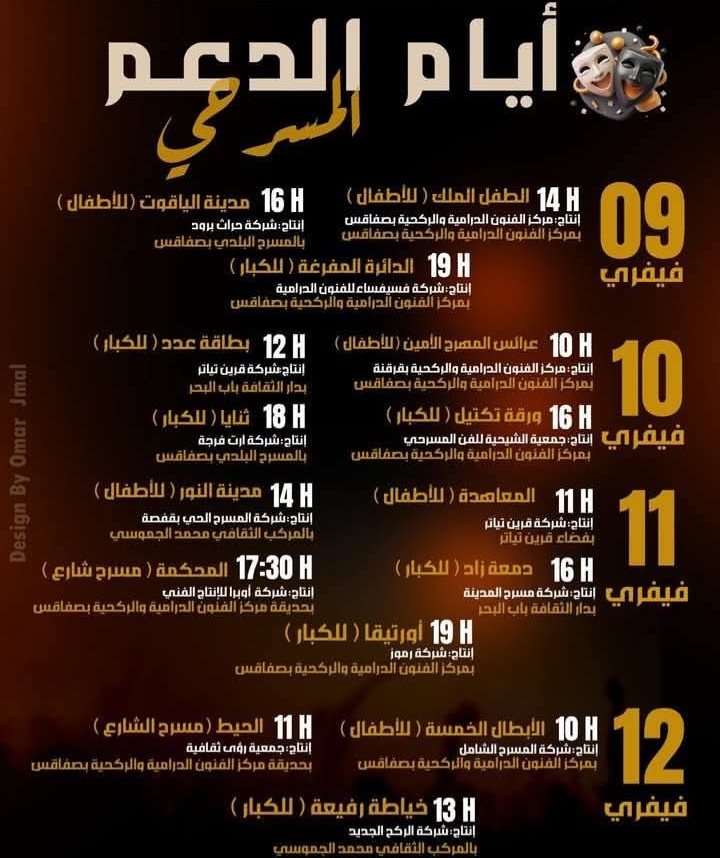 ينظم مركز الفنون الدرامية والركحية بصفاقس و مركز الفنون الدرامية والركحية قرقنة بالشراكة مع المركب الثقافي محمد الجموسي و دار الثقافة باب البحر و بلدية صفاقس والفضاء الثّقافي قرين تياتر تظاهرة ايام الدعم المسرحي بصفاقس من 9 إلى 12 فيفري 2026.
