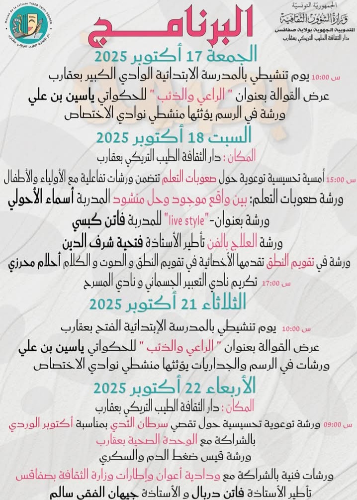 تنظم دار الثقافة الطيب التريكي بعڨارب تظاهرة بصمة في دورتها السادسة و ذلك أيام 17 – 18 -21 و 22 أكتوبر 2025، وفقا للبرنامج التالي.