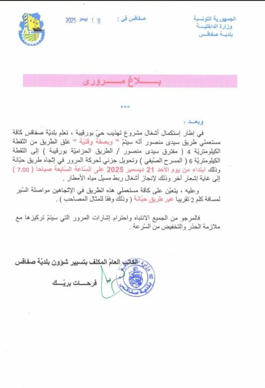 سيتم بصفة وقتية غلق طريق سيدي منصور من النقطة الكلومترية 4 إلى النقطة الكلومترية 6 ابتداء من يوم الأحد 21 ديسمبر 2025