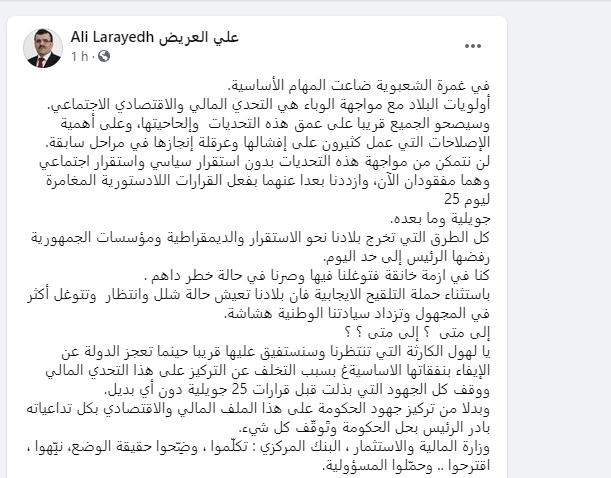 باستثناء حملة التلقيح الايجابية فان بلادنا تعيش حالة شلل وانتظار وتتوغل أكثر في المجهول وتزداد سيادتنا الوطنية هشاشة. إلى متى ؟ إلى متى ؟ ؟ يا لهول الكارثة التي تنتظرنا وسنستفيق عليها قريبا حينما تعجز الدولة عن الإيفاء بنفقاتها الاساسية بسبب التخلف عن التركيز على هذا التحدي المالي ووقف كل الجهود التي بذلت قبل قرارات 25 جويلية دون أي بديل.
