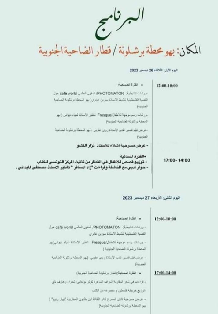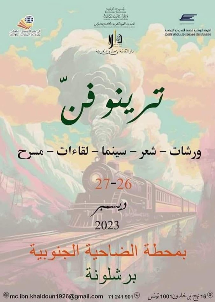 تحت إشراف وزارة الشؤون الثّقافية، وفي إطار دعم انفتاح المؤسسات الثّقافية على محيطها الخارجي ونصرة للقضية الفلسطينية تنظم دار الثقافة ابن خلدون المغاربية بالتعاون مع المندوبية الجهوية للشؤون الثقافية لولاية تونس وبالشراكة مع الشركة الوطنية للسكك الحديدية والمركز التونسي للكتاب “تظاهرة ترينو فن”.