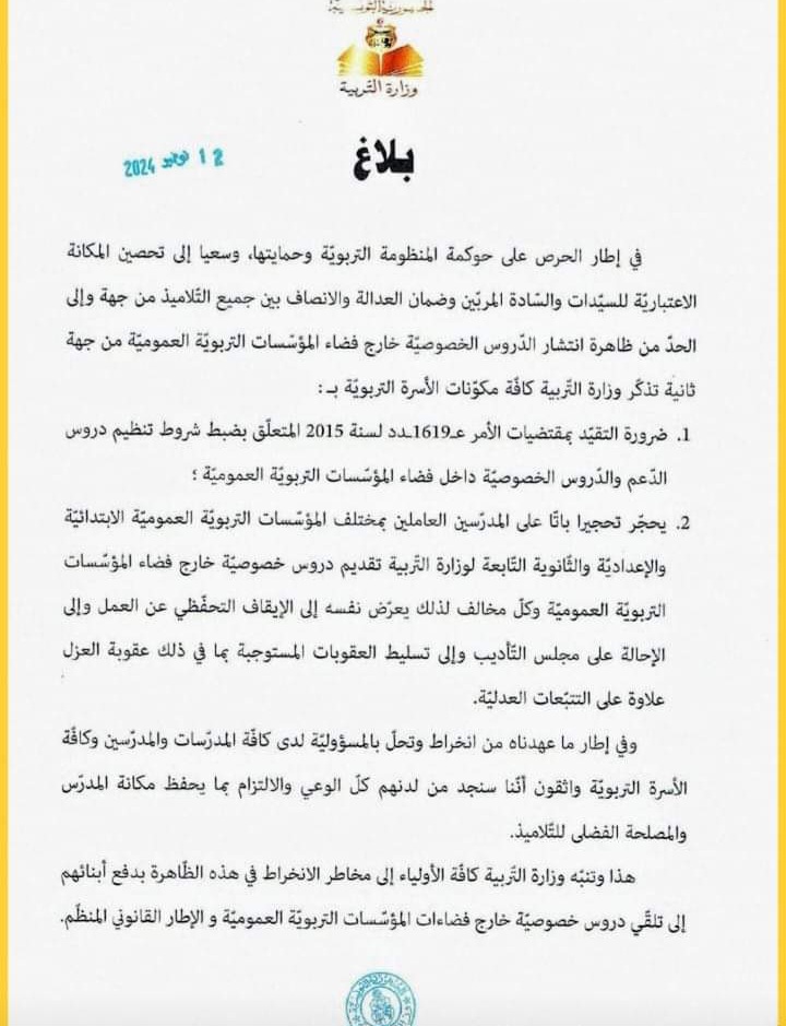 للحد من ظاهرة إنتشار الدروس الخصوصية: بلاغ من وزارة التربية.